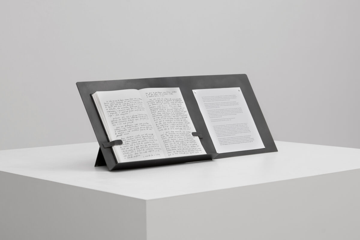 Confissão, 2025Caderno, impressão jato de tinta sobre papel e aço 24 x 60 x 16 cm vistas da exposição “A CRIME, A CONFESSION AND A TRADE” na Nicoletti (Londres, 2025)