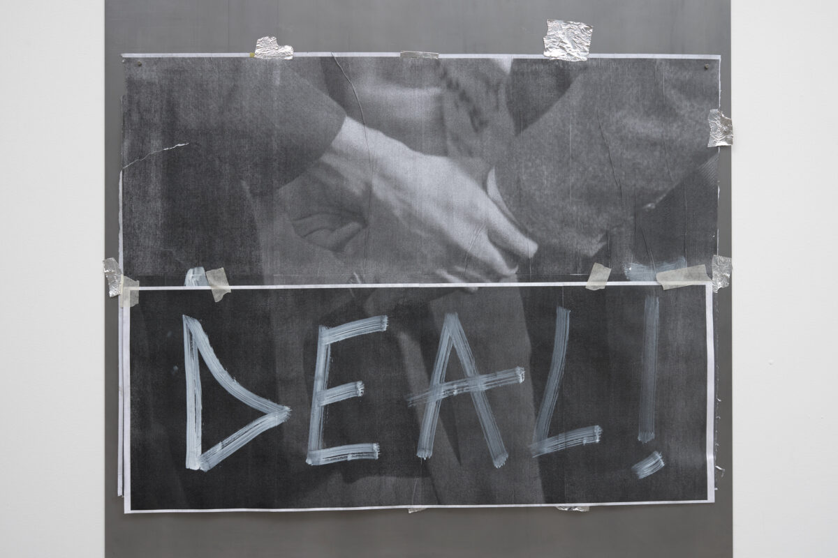 DEAL!, 2025Lambe, tinta óleo, fita crepe e metálica, imãs sobre painel de aço 134 x 83 cm vista da instalação na exposição “A CRIME, A CONFESSION AND A TRADE” na Nicoletti (Londres, 2025)