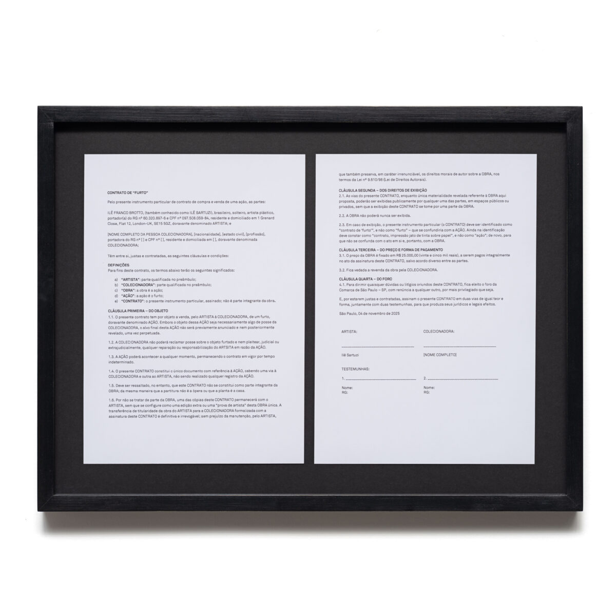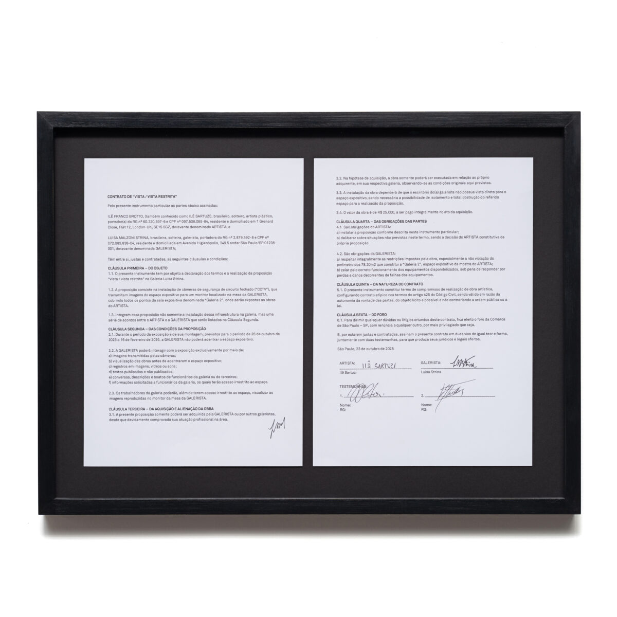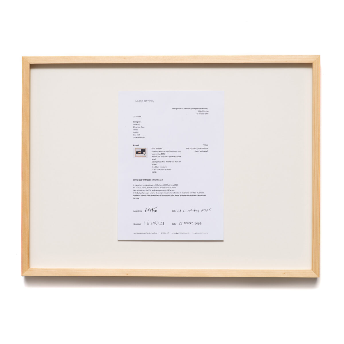 Consignação (Cildo), 2025 contrato de consignação, impressão jato de tinta sobre papel, obra de Cildo Meireles44 x 59 cm 17 ⅜ x 23 ¼ in Em Consignação (Cildo), o artista intervém na arquitetura da galeria para estabelecer a consignação da obra O morto, seu corpo, seu fantasma e uma testemunha (1991), de Cildo Meireles. Sartuzi […]